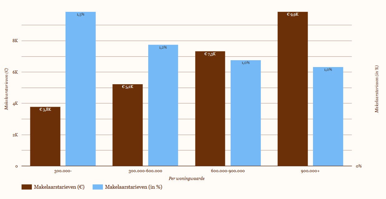 Van de vier grote steden is Amsterdam het duurst. Daar rekent een makelaar gemiddeld 6.600 euro voor een verkoop.